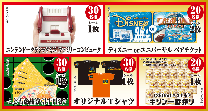 ご希望の賞品の枚数分応募シールを集め、応募ハガキに貼って必要事項を明記の上、 店内設置の専用応募箱にご投函頂くか、所定の料金分の切手を貼って キャンペーン事務局宛にお送り下さい。