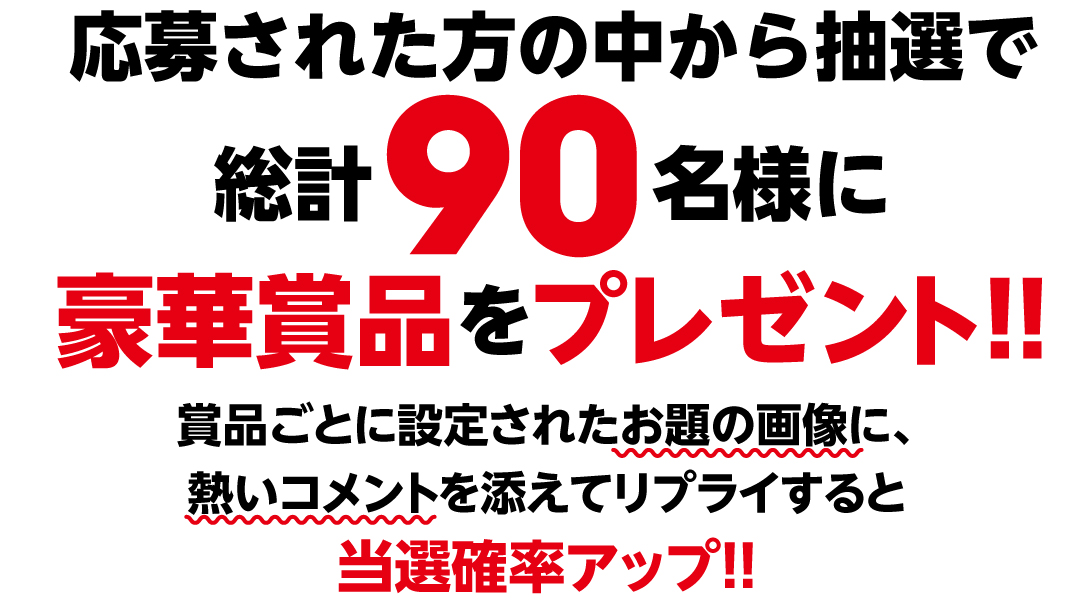賞品ごとに設定されたお題の画像に、熱いコメントを添えてリプライすると当選確率アップ!!