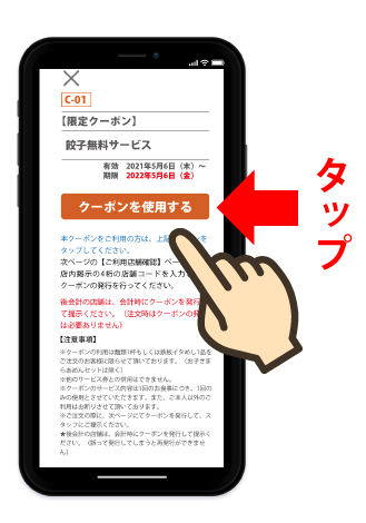 クーポンの発行は、会計時に【発行ボタン】をタップして発行し、スタッフにご提示ください。