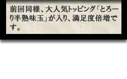 あの『嵐げんこつらあめん黒武者』が一回り大きくなって復活を遂げた。この『黒武者』は元々、花月嵐歴代No.1人気を誇る期間限定ラーメン『嵐げんこつらあめんブラック』の味の改良を行っている最中に、思いがけず誕生した、見た目はその違いが分からない程に似ているが口にすると全く趣が異なるという、言うなれば『ブラック』の影武者と呼ぶに相応しいラーメンであった。ところが3年半前の販売後、予想以上の反響が花月嵐ラーメンマエストロ達に届いた。『ブラックも好きだが、同じくらいに黒武者もまた食べたい味』との高い評価。『ブラック』にも負けないラーメンになるよう、花月嵐ラーメンマエストロ達は、再登場にあたり連日厨房に向かい、新生『黒武者』の研鑽に励んだ…。