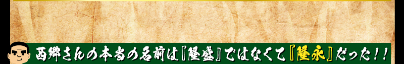 当時は音読みで名前を言うのが流行っており、隆永を『りゅうえい』と発したところ役人が『りゅうせい』と聞き違え『隆盛』が戸籍の名として残った説、または戸籍を作る際に本人が不在で、その本名を周りの者が理解しておらず、父の名の隆盛を間違って記されたという説等があるようです。なぜ、西郷さんは訂正をしなかったのか?「命もいらず、名もいらず、官位も金もいらぬ人は始末に困るものだ。しかし、この始末に困る人でなければ、国家の大業は成し得られぬなり。」とは西郷さんの残した言葉。自分にとって名前など意味がないとの考えがあったようです。因みに弟の『西郷従道』も本名は『隆道』というから兄弟して何とも珍しい話です。