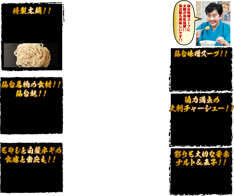 あっさり炊き出した動物系スープに、しっかりとした深みのある味わいの「仙台味噌」を組み合わせて生まれる味わい。