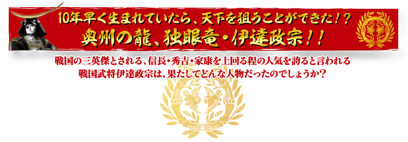 永禄10年(1567年)誕生。幼名は『梵天丸(ぼんてんまる)』と言いました。5歳の時に天然痘にかかり、一命は取り留めるものの右目を失明。11歳で元服し『藤次郎政宗』と名乗り、18歳で家督相続しますが、以降、家族内の不和が生じたものの、わずか6年足らずで東北の大部分をまとめ上げ天下統一を志しました。しかし、時すでに遅し。天下統一は豊臣秀吉によってなされる一歩手前で、天下人秀吉への臣従。そして江戸時代では徳川家に仕えることとなりました。仙台城の築城、そして城下町を整備するなどして、藩祖として仙台藩62万石の礎を築き上げました。