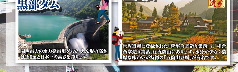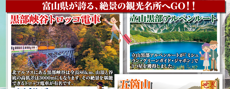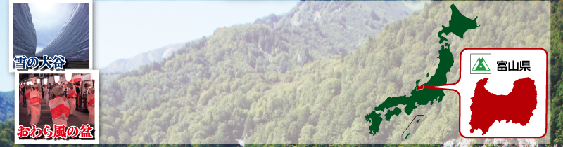 富山県は中部地方の日本海側、北陸4県(新潟県、富山県、石川県、福井県)のほぼ中央に位置しています。 山と海に囲まれた美しく自然豊かな魅惑の海鮮グルメや、世界遺産にも登録された五箇山、「ミシュラン・グリーンガイド・ジャポン」で3つ星に輝いた立山黒部アルペンルート等、見所満載です。 『越中八尾おわら風の盆』は300年余の歴史があるお祭りで、哀愁ただよう旋律にあわせ、踊り手が街を踊りながします。