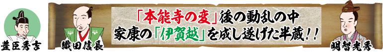 1582年(天正10年)に本能寺の変は起きました。天下統一目前の織田信長に家臣の明智光秀が引き起こした日本史史上、他に類を見ない謀反です。天地がひっくり返る程の状況の中で、信長に堺に招かれていた徳川家康は、急遽、自国の三河の岡崎に戻ることになりました。というのも光秀は、信長を討ち取った後に、天下を我が物にせしめるために、豊臣秀吉や徳川家康などの有力な武将へも狙いを定めていたからです。光秀が差し向けた追っ手などから逃げ切らないといけなかった家康が引き連れていた側近は、僅かに30数名。その道中一行を先導したのが、伊賀の二代目服部半蔵正成だったのです。伊賀の山中では伊賀忍者しか知らない道を進んだため、家康一行は、追手に見つかることなく無事に険しい伊賀の山道を越えたことから、それを「伊賀越(神君伊賀越)」と呼ぶようになりました。