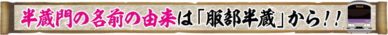 後に、徳川家は江戸幕府を治めることとなりますが、歴代の服部半蔵が、徳川家の警護をするようになりました。今日では、都内地下鉄の路線名にもなっている「半蔵門」。実はこの地名は、服部半蔵に因んだ名前。徳川家を警備した歴代の服部半蔵が守り続けた江戸城の門(江戸城西門)から、その地をこの名で読んだそうです。