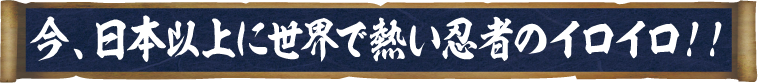 忍者は「NINJA」と表記される程に今世界で最もホットなコンテンツの一つとして確立されています。近年では、漫画「NARUTO-ナルト-」が世界中の若者の間で大ヒットする等、これまで多くの忍者作品が世界で脚光を浴びてきました。今日では海外から多くの観光客が日本で忍者体験を楽しむなど、ますます忍者人気は白熱することでしょう!!!