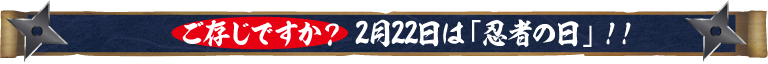 皆さんは、2月22日が「忍者の日」として日本記念日協会により正式に認定されていることをご存知でしょうか?『ニンニンニン』の語呂合わせで2015年に制定されたそうです。 そして、「忍者の日」を記念して、2月2日から2月22日の間は、日本忍者協議会によると「忍者の日」キャンペーンのもと、日本各地で様々な忍者イベントが開催されるとのこと。興味がある人は、この機会に、いろいろとググってみてはいかがでしょうか?もちろん、今年の2月22日(金)は、花月嵐で「嵐げんこつらあめん服部半蔵」を注文するのはお忘れなく!!