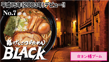 期間限定ラーメン初期を代表する、ブラック・マー油が特徴の『ブラック』は、余りの大人気ぶりに、予定外の『販売期間延長』『半年後復活』そして『レギュラーメニュー仲間入り』等の快挙を達成した。