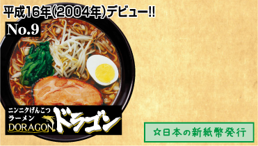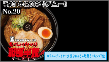 平成の最後に登場したシリーズ最新作。『伊賀越』天然醸造醤油に魚介の組合せ。黒色のナルトや手裏剣をイメージした海苔の盛り付け等、花月嵐ラーメンマエストロ達の遊び心が散りばめられている。