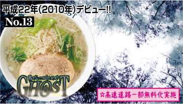 塩味で見た目も『幽霊』をイメージさせる白色のスープであることから『ゴースト』の名に。そこに至るまでの紆余曲折の道のりを辿る話はHP『㊙期間限定ラーメン開発レポート!!』にて公開中。