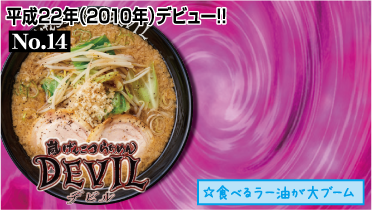 『モンスター』『ゴースト』に続くモンスターシリーズの完結編『デビル』。食べれば食べるほど、また食べたくなる魔性の甘醤油仕立てが大ヒット。シリーズは終わらず、翌年の『ガッツ!!』へと延長された。