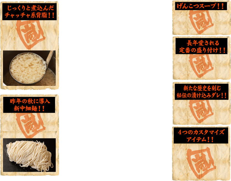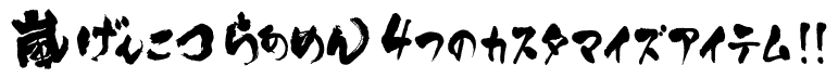 4つのアイテムを駆使してあなただけのカスタマイズを楽しもう!!お好みのトッピングも加えて、あなただけの、嵐げんこつらあめんをどうぞ!!