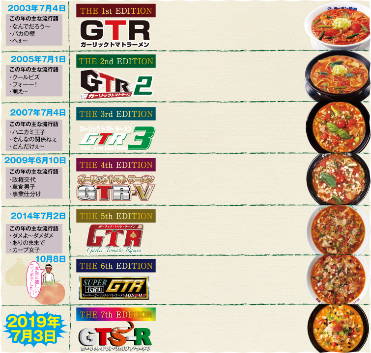 約5年の時を経ての再デビュー!!これまでのインパクト重視ではなく、一杯のラーメンとしての緻密な完成度を追求した一杯。シリーズの新たなる第一歩という意味合いを込めて、初代と同じ「GTR」というネーミングで販売された。そしてその後、まさかの展開に!!