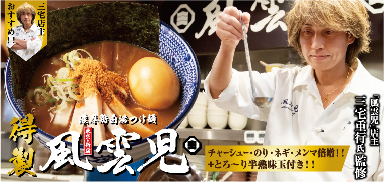 - 風雲児の最大の特徴と言える「鶏白湯×魚介」のWスープ!!濃厚ながらもすっきり洗練された味わいで、オフィス街の女性や、海外のつけ麺ファンからも絶大な支持を受け、東京新宿で大行列を作り続けている。