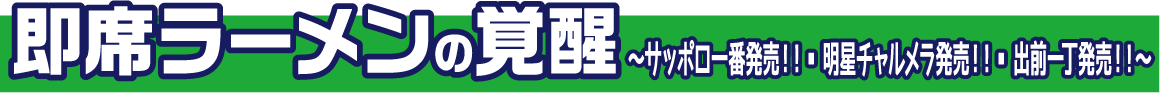二十世紀の大発明の一つとも言われる即席ラーメン!!世界の食文化を変え、人類の時間感覚にも変化をもたらしたとも言えるそのはじまりは、1958年に日清食品から発売された「チキンラーメン」。魔法のラーメンと呼ばれ爆発的なヒット商品となった。1966年には「サッポロ一番」、「明星チャルメラ」が発売、1968年には「出前一丁」が登場!!1960年代は現在に至るロングセラー商品が続々とデビューを果たしたのだった。