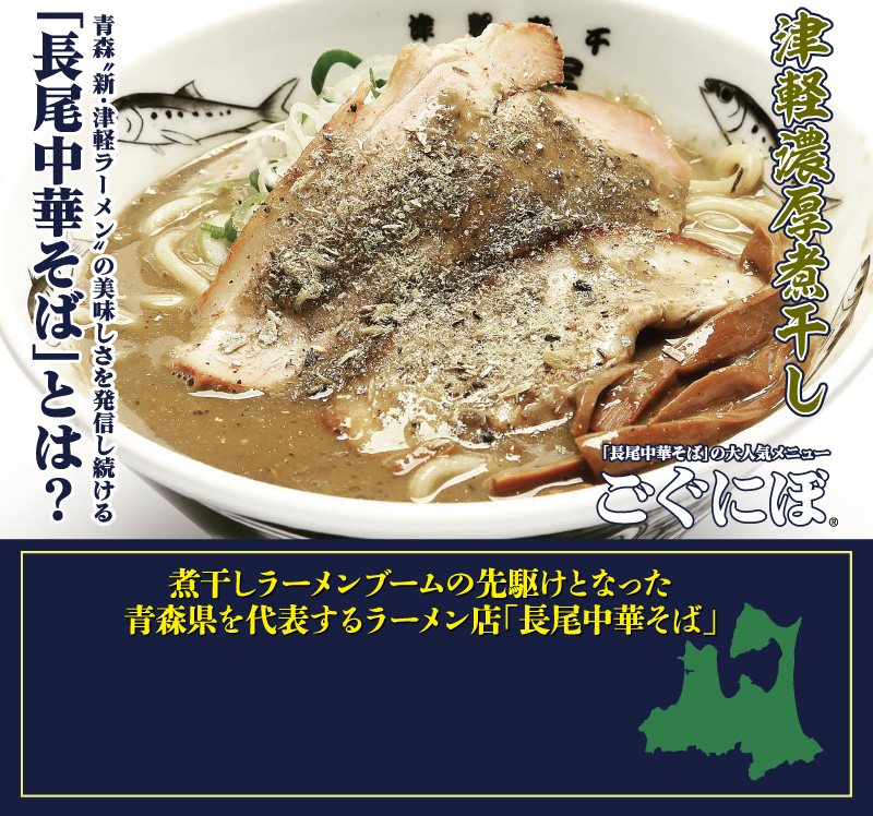 2004年に長尾大店主が出身地である青森県で創業したラーメン店。津軽ラーメンの「王道系(あっさり系)」と「濃厚煮干し系」という異なる個性を持つ二刀流メニューを打ち出した初めてのラーメン店として注目され、カップ麺やチルド麺にも登場し全国にその名が轟いた。現在は青森だけでなく、東京、仙台、名古屋にも店舗があり「青森の味を全国へ」をテーマに、全国で開催されるラーメンイベントなどに積極的に参加し「津軽ラーメン」の魅力を伝え続けている。