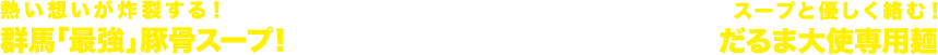 最強・群馬豚骨スープをしっかり絡めながら豪快にすすれる「だるま大使専用麺」。この麺だけは一発で決まったほど、だるま大使・黒崎店長も大絶賛のクオリティ!今回は替玉もできるので、思う存分ご堪能ください!