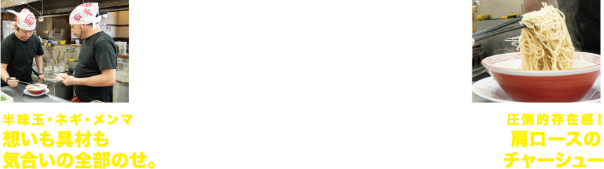 圧倒的迫力で食欲をそそりまくる、ジューシーかつ、食べやすく優しい肩ロースのチャーシュー!スープとの相性はもちろんのこと、ライスを巻いて豪快に食べるのも最高だ!