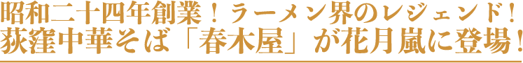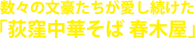 昭和24年。戦後間もない東京・荻窪の屋台からはじまった「春木屋」の歴史。当時から荻窪近辺の中央線沿線には、時代を代表する文豪たちが生活の拠点として暮らしており、様々な作品の中で「春木屋」の中華そばを描き続けてきました。その後も時代を超えて「春木屋」は愛され続け、著名人、芸人、作家、アーティストたちが世界中から“その味”を求め訪れています。
