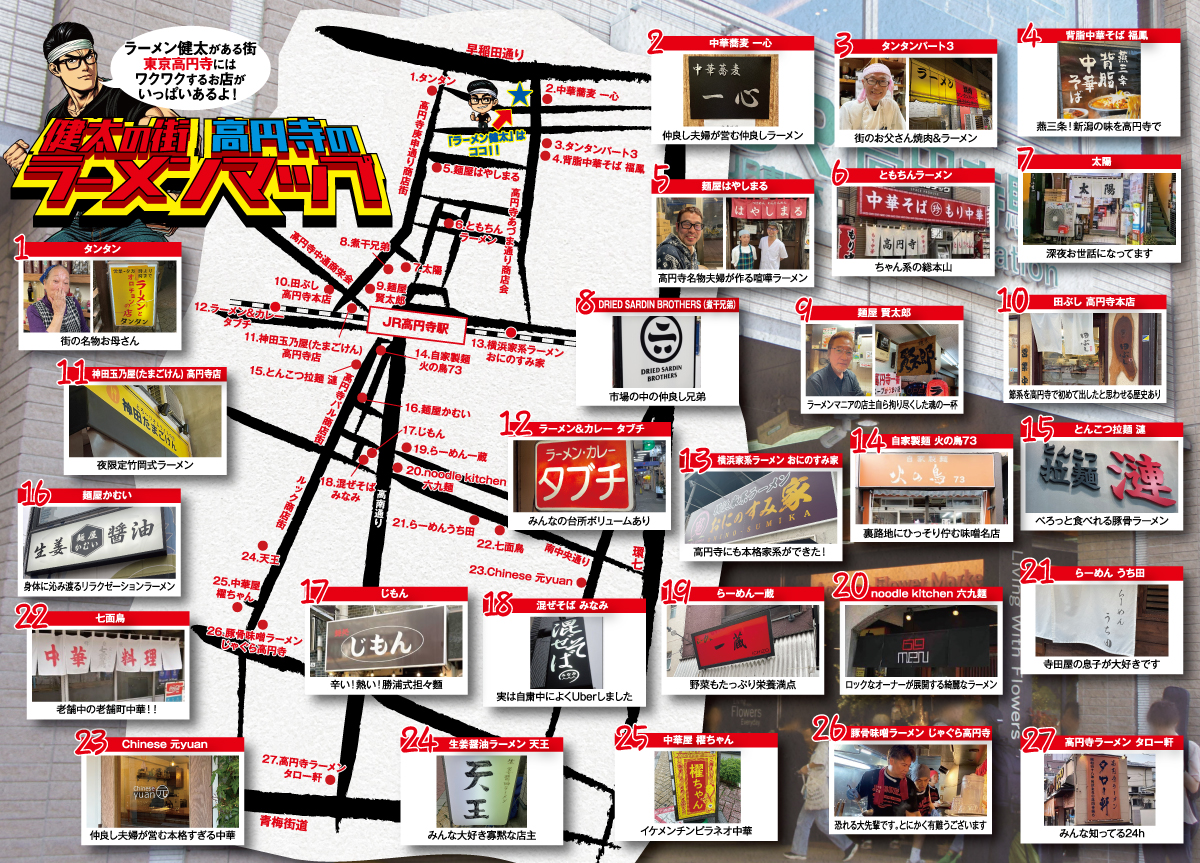 「ラーメン健太」がある高円寺は、東京の中心から少し離れた場所にある伝統と現代が融合するユニークな街。古着屋、フリーマーケット、カフェなどが並び、アートと音楽が日常的な風景の一部になっています。昼は静かな印象をうけますが、夜になると一変してエネルギッシュな雰囲気に包まれるのも特徴。また、食べ物が美味しいのも魅力の一つ。長年愛され続けているお店から、エキゾチックな料理を楽しめるお店まで、様々な飲食店が多数あります。何度も足を運びたくなる魅力にあふれた街、それが高円寺です。