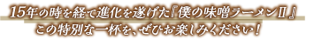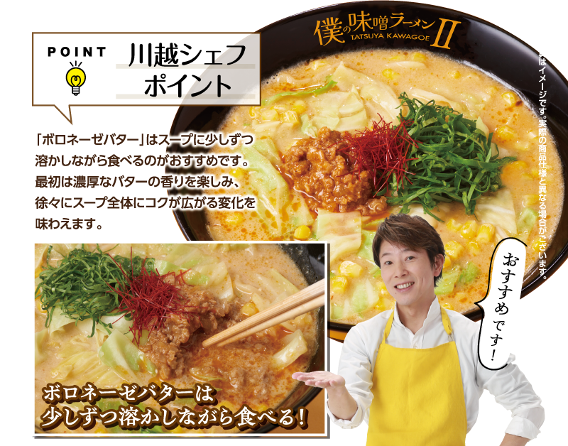 川越達也シェフ監修の伝説の一杯「僕の味噌ラーメン」が、約15年の時を経て、さらなる進化を遂げて帰って きました!『僕の味噌ラーメンⅡ』は、前作の魅力をそのままに、新たな要素を加え、さらに美味しさを追求した一杯です。 これは、今の僕が表現する最高の味噌ラーメンです。