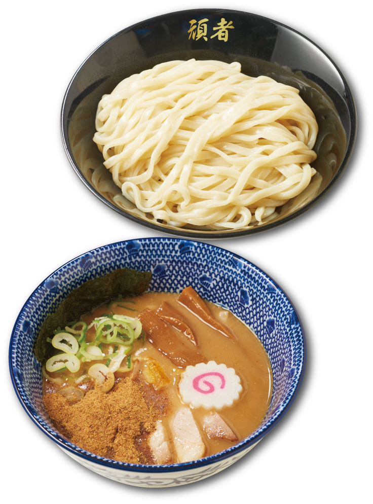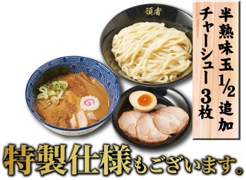チャーシュー3枚と半熟味玉が追加される特製トッピングもご用意。チャーシューがほどよい満足感をプラスし、とろりとした半熟味玉が、濃厚なつけダレにまろやかさとコクを与えます。頑者の味を、もう一歩深く楽しみたい方におすすめです。