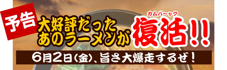 昨年、期間限定で登場し、みんなのハートを奪い去った「ラーメン街道一番星」が、あなたの熱いコールに応えて、遂に帰ってくる!勿論、その旨さはひと回りもふた回りもデッカクなって帰ってくるに違いない。「え!どれくらいデッカイって?」それが分からないところが、一番星が一番星たるゆえん。簡単に予想ができないから、一番星なんだ。