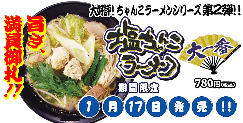 2007年1月17日(水)に、ちゃんこラーメンシリーズ第2弾!『塩ちゃんこラーメン大一番』がいよいよ登場致します。冬と言えば鍋、鍋と言えば味噌味、という事で『味噌ちゃんこラーメン大金星』が冬の期間限定ラーメンとして、既に発売しておりますが、当然ながら『味噌ちゃんこラーメン大金星』が商品化される前に、多くの紆余曲折がありました事は前回の開発秘話でご紹介した通りです。