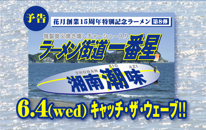初夏を迎えると、「今年の一番星はどんなだろう」と胸躍らせる方もきっと多いことだろう。『ラーメン街道一番星』は3年前、花月にデビューしてから毎年この時期になると味わうことの出来る、花月を代表する期間限定ラーメンの一つである。今年の一番星は、スープの醍醐味をじっくりと味わえる塩系へと方向を変えて花月ラーメン職人の男達がチャレンジをした。 『塩ラーメン』は一般に、繊細な味わいのため、細麺を用いることが多いのである。 しかし彼らはその常識を打ち破るべく、一番星ならではの食べ応えのある太麺を使い、その麺に負けない力強くも爽やかさの感じられるスープを完成させた!!まさにそれは、湘南の潮風に吹かれ、ボードひとつで波に挑む、サーファー達の疲れた体に再び活力を与える、そんなイメージのラーメンである!! そうして生まれた今年の『ラーメン街道一番星』はその名もズバリ『湘南潮味』と命名された…。