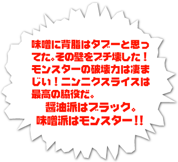 大量の背脂と、独自に配合された味噌が相まって誕生した極旨味噌スープ。そのスープと相性バツグンの食べ応えのある極太麺。さらにたっぷりの茹で野菜が入ることで、ボリュームそして味、ともにこれまでにはない、怪物と呼ぶに相応しい『嵐げんこつらあめん』が誕生したのだった…。