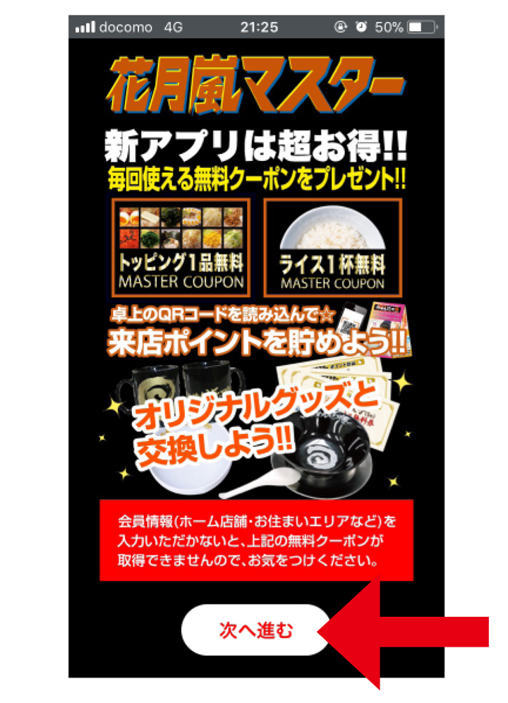 アプリを起動すると左記の画面が表示されます。画面下の「次へ進む」ボタンを押して、会員情報登録ページにお進みください。
