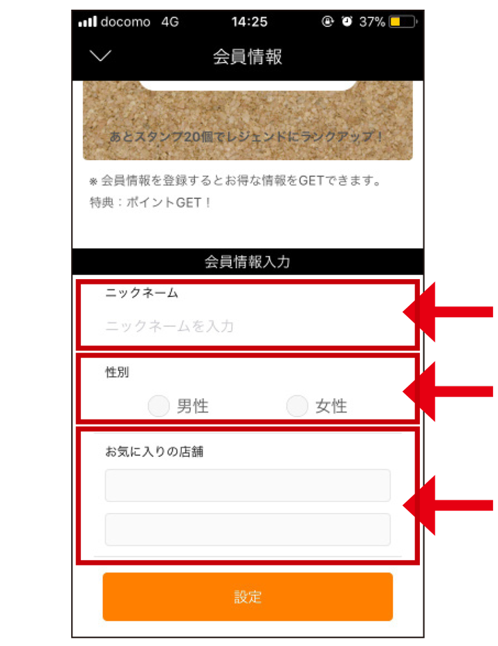 会員情報ページが表示されたら、項目:「ニックネーム」「性別」「お気に入りの店舗」を選択して、設定ボタンを押します。