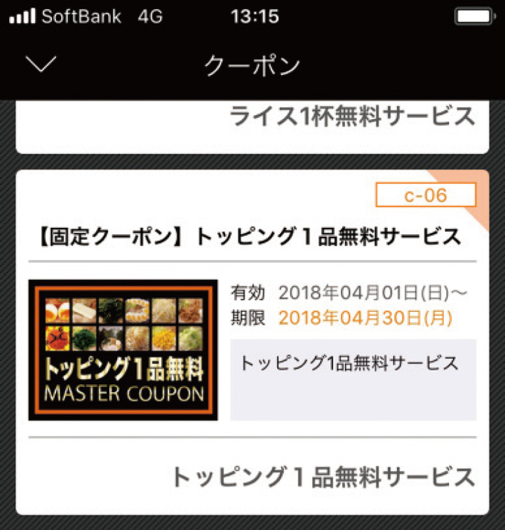 登録が完了すると、マスタークーポンページに「トッピング1品無料クーポン」が配信されます。