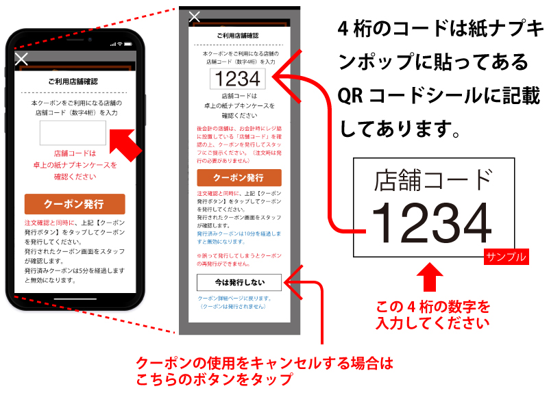 ※後会計の店舗は注文時にクーポンを発行する必要はありません。詳しくは、【後会計店舗】の案内ページを確認ください。