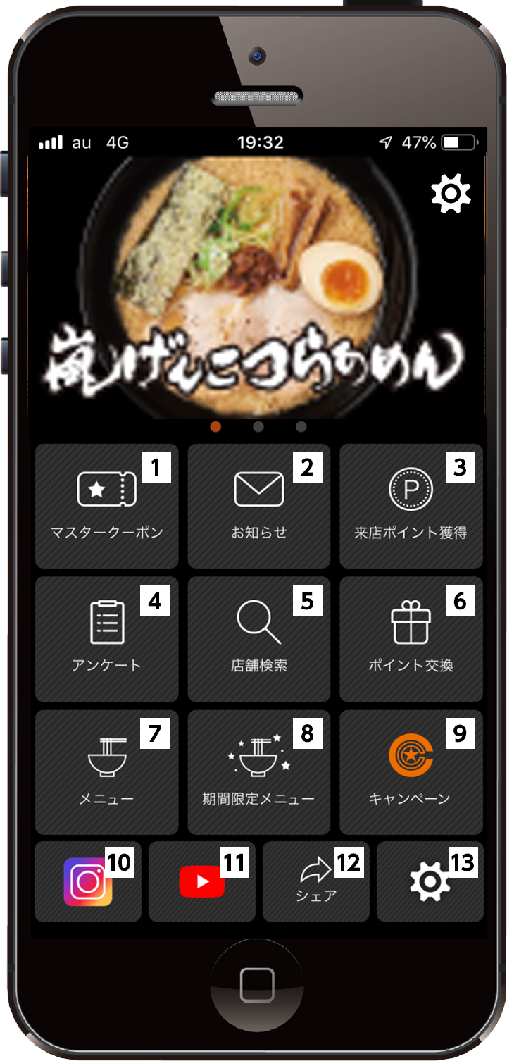 個人情報:会員番号の確認や個人情報(ニックネーム・お気に入り店舗)の修正ができます。