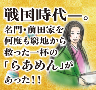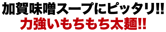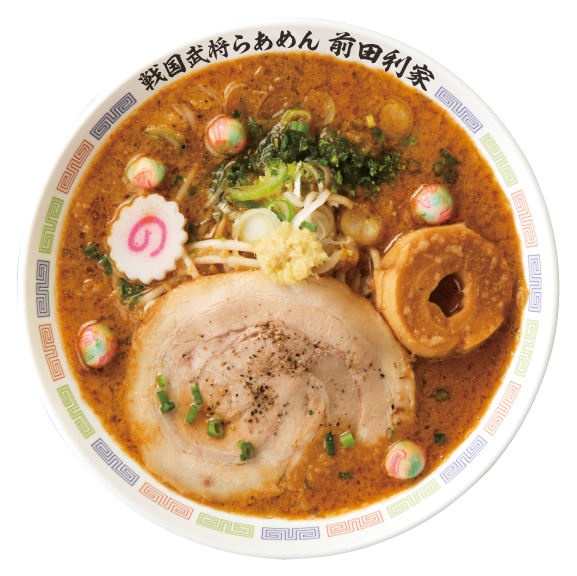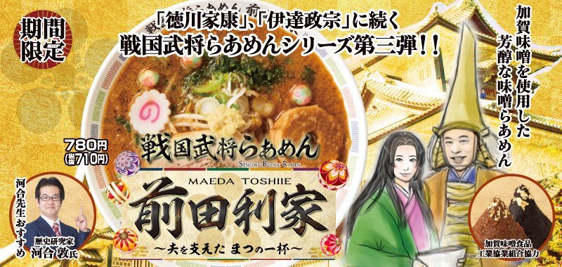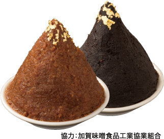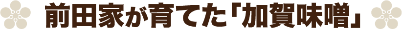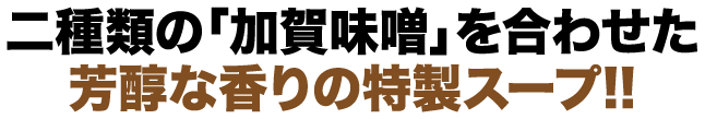 戦国時代に兵糧として重宝された味噌。1583年(天正11年)に前田利家が金沢城主になってから、加賀藩でも軍用の貯蔵品として盛んにつくられるようになりました。それが「加賀味噌」の起源です。今回の商品は、天然醸造した田舎味噌の“豆粒味噌”と、豆粒味噌をさらに三年間熟成させた“三年味噌”の二種類の加賀味噌を合わせたタレをスープに用いています。味噌の中に大豆の粒が入っているのが特徴で、スープの中に味噌粒を見つけられたら幸運だといわれています。