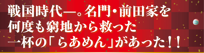 2020年1月…。『家康公』、『伊達政宗』に続く、花月嵐の大人気企画『戦国武将らあめんシリーズ』の第三弾が登場!!その名も『戦国武将らあめん前田利家~夫を支えた まつの一杯~』。今回登場する一杯は、激動の戦国時代を加賀百万石の大大名にまで上り詰めた武将・前田利家をイメージ。その利家を絶体絶命の窮地から何度も救った“らあめん”があったとしたら…。