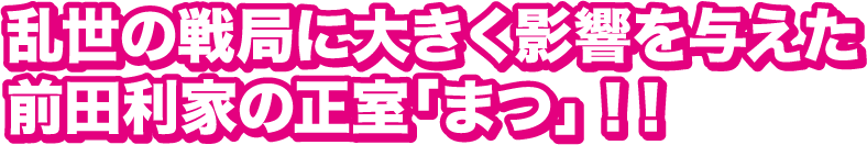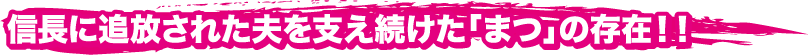 利家は勇猛果敢でしたが短気な面もあり、それによる失敗が原因で、信長に一度追放され浪人生活を送った経験があります。信長の許しを得ようと桶狭間の戦いに勝手に参戦して武功を挙げるも、信長からの許しは得られず意気消沈します。そんな利家を励まし、苦しい浪人生活を支え続けた「まつ」。その後、利家は大活躍し、信長の許しを得ることが出来ました。
