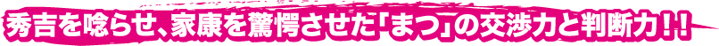 柴田勝家と秀吉の覇権争いの板挟みになっていた利家。すると柴田勝家は、利家の長年の働きに感謝したうえで、自分ではなく、親友である秀吉につくように言葉をかけます。その話を聞いた「まつ」は大胆にも自ら秀吉の元に出向き、悩む夫に代わり素早く秀吉軍との和議を取り付けたというエピソードが伝えられています。利家の死後、まつは髪を下ろし「芳春院」と称します。前田家を恐れている家康は、前田家に謀反の疑いをかけます。このままでは前田家は取り潰しになり、さらには戦乱も長引いてしまうと判断した「まつ」は、初め交戦を主張していた息子を宥め、自ら人質となって江戸へ向かい、前田家を守り抜いたのです。