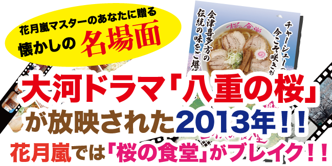 NHK大河ドラマ「八重の桜」の舞台でもある会津藩。喜多方市は、その北側にあったことから以前は「北方」と呼ばれており、明治8年、昭和29年の町村合併により「喜多方市」と命名されたと言われている。ちなみに「八重の桜」が放映された2013年、花月嵐では「喜多方らあめん 桜の食堂」を発売しており、その圧倒的な旨さからレギュラーラーメンにして欲しいという熱い声が飛び交った!!喜多方ラーメンがレギュラーに登場する日は来るのか!?