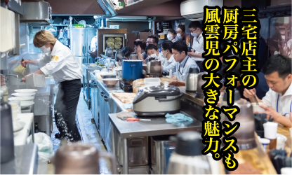 2007年の創業から13年、ラーメン激戦区・東京新宿で、途切れることのない行列を作り続ける名店。 お客様の7割程が女性ということもあるほど、老若男女問わず人気のあるお店でその最大の魅力は濃厚ながら臭みのない鶏白湯と魚介のスープ。 海外のラーメンフリークたちからも絶大な支持を受けている。俳優、イタリアンの料理長、ホテル支配人という異色の経歴を持つ三宅店主が放つ通称「ジェットコースター」とも呼ばれる厨房パフォーマンスも大きな魅力。