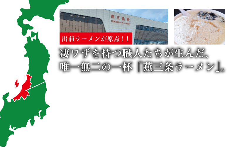 新潟県のほぼ中央に位置する燕市と三条市は、古くからものづくりが盛んな町。江戸時代初期に取り入れた和釘の製造技術が原点といわれ、金属加工の技術は世界各国から注目を集め、なかでもApple製品「iPod」を磨いた技には世界中が驚愕した。「燕三条ラーメン」は、暑い工場で働く職人たちへの出前ラーメンとして生まれ、大量の汗を出しつつ働く人達のために塩分を多く入れ、その塩分の緩和、そしてスープが冷めないようにたっぷりの背脂を投入。さらに食べるまでに麺が伸びてしまわないようにと、極太麺が採用されたという。その確固たるスタイルは、 話題を呼び、燕市全域、三条市へも広がり、メディアなどでも紹介され、 新潟5大ラーメンの一つ「燕三条系ラーメン」という名称で親しまれ、 全国区のご当地ラーメンとなった。
