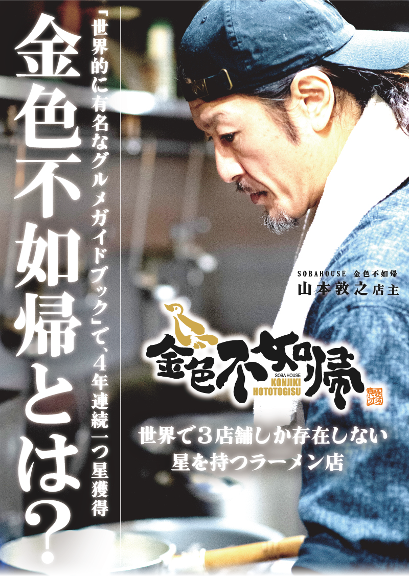 東京新宿御苑に本店を構える日本を代表するラーメン店『SOBAHOUSE 金色不如帰』 オンリーワンをテーマに店主・山本敦之氏が創り出した“蛤(はまぐり)を大量に 使った一杯”は、世界トップクラスのシェフたちからも「絶対に真似できない最高の 味」と評され、世界的に有名なグルメガイドブックでは“一つ星”を4年連続で獲得し、 その独創的なラーメンは世界の美食家たちを唸らせ続けている。2017年にカナダ で海外進出を果たし、現在はシンガポール、香港にも店舗を展開。「世界においしい ラーメンを広めたい」という山本店主の熱い想いが込められた一杯は今この瞬間 も進化を続けている。