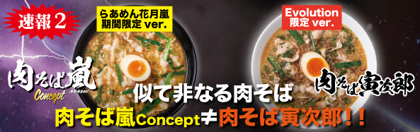 5月の期間限定ラーメンは、花月嵐バージョンの肉そば 『肉そば嵐Concept(以下肉そば嵐)』が登場!! この商品はEvolutionで販売している 『肉そば寅次郎(以下寅次郎)』がモデルになっています。 どちらも醤油ベースですが、実際に食べると 似て非なるもので、味は全くの別物。 『肉そば嵐』は“たまり醤油”を使用した 今回だけの特別なレシピで作られたスープが特徴。 数量限定販売のため、この機会を逃したら二度と食べられない!! 一方、『寅次郎』は次期レギュラーメニューを狙えるルーキー。 立場は違いますが、どちらもオススメの商品です!!