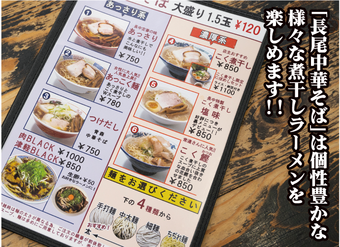 2004年に長尾大店主が出身地である青森県で創業したラーメン店。津軽ラーメンの「王道系(あっさり系)」と「濃厚煮干し系」という異なる個性を持つ二刀流メニューを打ち出した初めてのラーメン店として注目され、カップ麺やチルド麺にも登場し全国にその名が轟いた。現在は青森だけでなく、東京、仙台、名古屋にも店舗があり「青森の味を全国へ」をテーマに、全国で開催されるラーメンイベントなどに積極的に参加し「津軽ラーメン」の魅力を伝え続けている。