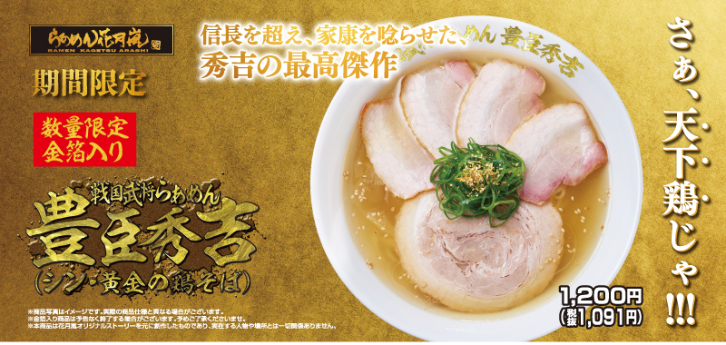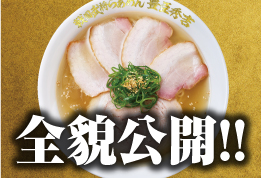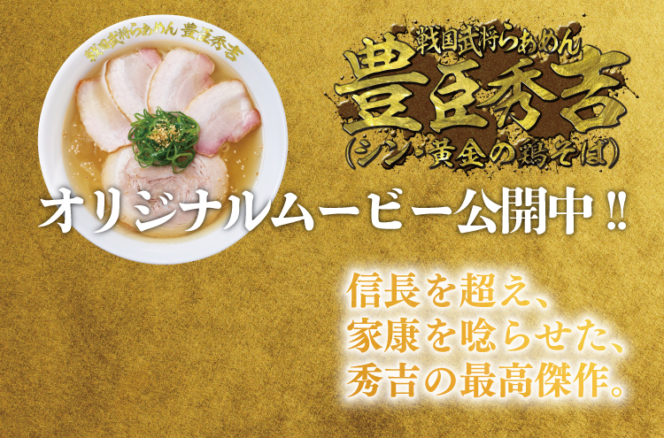 丼のど真ん中に豪快に盛り付けられた大判チャーシューと4枚の燻しチャーシュー!そして、スープの旨味をぐっと引き立てる白ゴマ、ネギ、さらに味変アイテムとして添えられる「辛ごぼう」は、秀吉公の藤吉郎時代の面影が演出されているという。