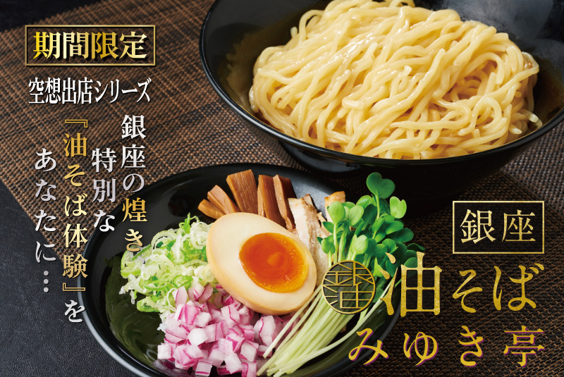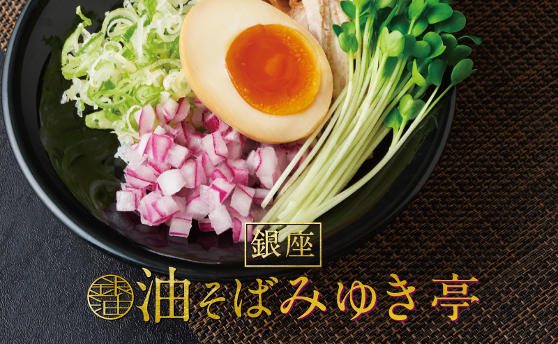 - 銀座油そばみゆき亭の具材は、ネギ、メンマ、味玉、刻みチャーシュー、カイワレ、レッドオニオンをご用意。様々な食感の具材により、最後まで飽きることなくお召し上がりいただけます。