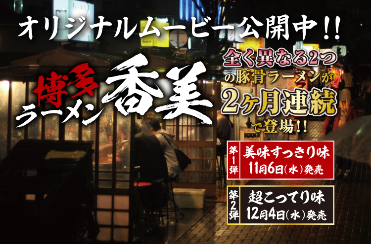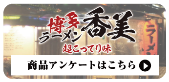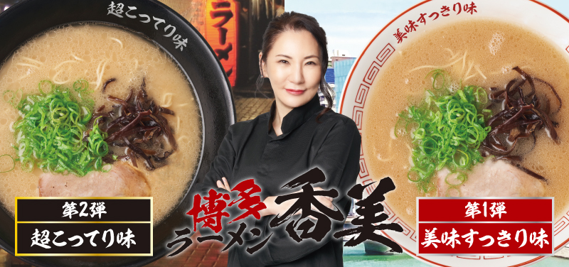 - 博多ラーメン香美企画第2弾となる今回のスープは、まさに「どとんこつ」と呼ぶにふさわしい、超こってりスープ!豚頭をベースに、背ガラやコミガラなどをふんだんに使用し、濃厚でこってりとした味わいに仕上げました。スープに負けないよう、タレの旨みも強めにし、絶妙なバランスを実現しています。広瀬さんこだわりの「どとんこつスープ」を、ぜひお召し上がりください!