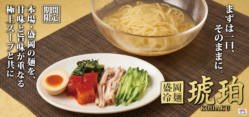 - 盛岡の老舗製麺所「中野製麺」が手がけた、北海道産の馬鈴薯澱粉と厳選された小麦粉を主原料とする、特製麺を使用。ツルッとした喉ごし、力強いコシ、モチモチとした食感。冷たい一杯の中に、上質な“しなやかさ”が広がります。